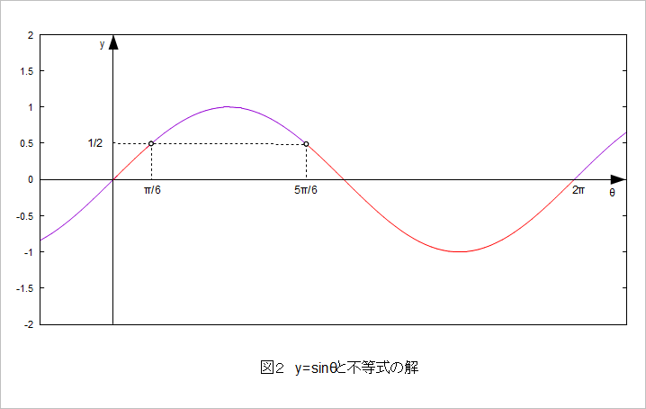 sinθが1/2になるのはθ=π/6、5π/6でした。グラフ上にこの点をうって、yの値がこの点の値より小さいときが探している範囲です。グラフの形状を見てその部分を判断すると、図2では赤い線の部分です。