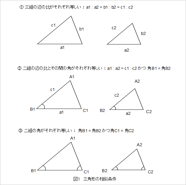 図1に相似条件をまとめます。これらの条件を使って二つの三角形が相似であることを示せれば、片方の長さがわかればもう片方の長さも求めることができます。この性質を測量に利用することなんかも可能です。