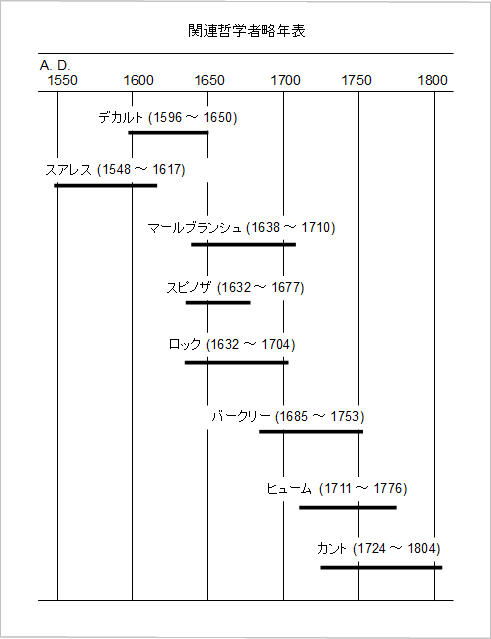 スアレスは個体を唯一のものとする他のものとの差異を「実体形相」と考え、「ないということ」ではなく「ない」なるものがあると考えています。このイデア主義がこの時代の認識論の特徴で、マールブランシュは知覚や認識をものの本質たる観念(イデ)とその代理である完全なる神の観念(イデア)の関係で説明しようとしています。ものは神のイデアをもとにするイデを持ち、人間の精神は物質的次元のものではなく、ものの本質であるイデを認識しているというふうにです。スピノザも、神の無限の属性のうち人間の精神が認識できるのは思考と延長のみ、と考えている点で彼らの思考と類似します。