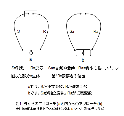上の事柄に関連して、動物行動の始発項を外部に置くか内部に置くかの違いによる、「外からのアプローチ」と「内からのアプローチ」の二つの立場があります。図1にこの二つの考え方の略図を示しておきます。一見、始発項を外部に置くか内部に置くかだけの図に見えますが、他の対立項の出発点をも含んでいます。
